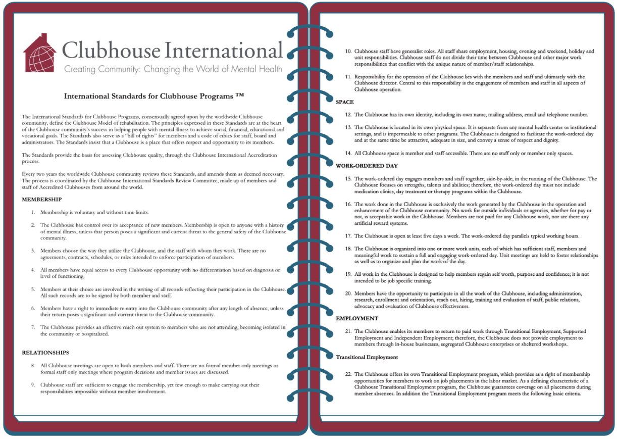 The International Standards for Clubhouse Programs ™ (Standards) are the “Best Practices” of the Clubhouse International model for encouraging, supporting and assisting people living with mental illness as they pursue recovery and a personally meaningful and satisfying life.The Standards serve as the sufficient and necessary elements of any organization wishing to implement the Clubhouse approach to psychosocial rehabilitation. They define the characteristics of the model as it has evolved from the original Fountain House program in New York City. Today the Standards represent the best thinking and effective practices of members, staff and board members of hundreds of Clubhouses operating in more than 30 countries on six continents. The Standards and the Clubhouse International model now describe a truly international approach.